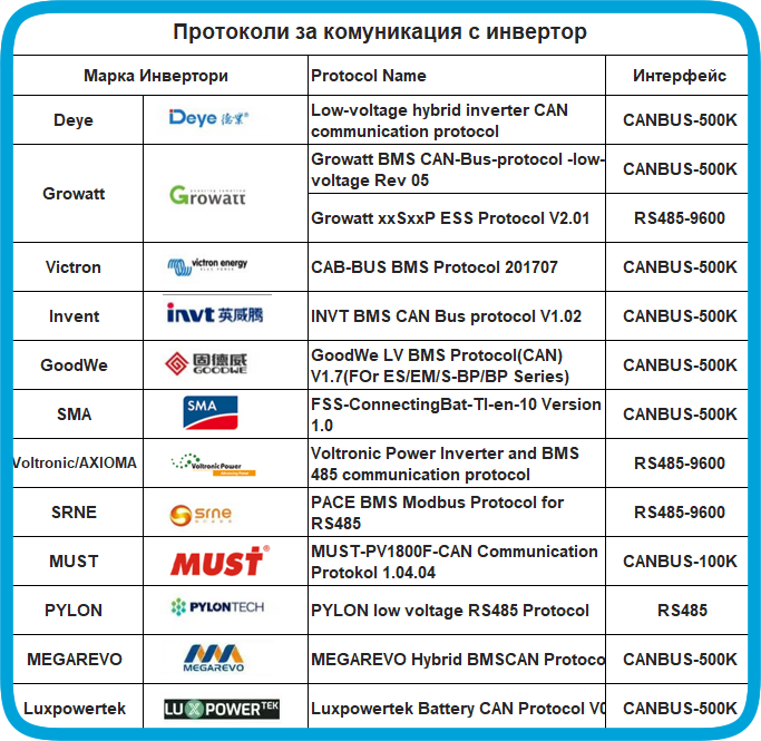 Нашата система е съвместима с хибридни инвертори Deye, Growatt, Victron, Invent, GoodWe, SMA, Voltronic, AXIOMA, SRNE, MUST, PYLON, MEGAREVO, Luxpowertek и много други, които осигуряват оптимална ефективност и лесна интеграция.